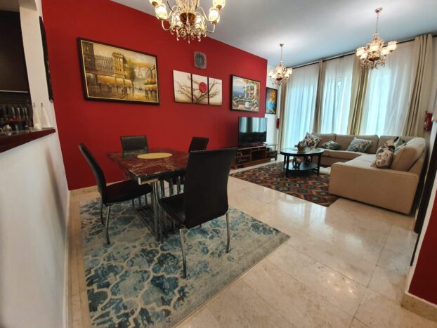 The apartment comes fully furnished, featuring a thoughtfully designed layout that maximizes space and functionality. The living and dining area is bright and welcoming, complemented by tasteful furnishings and large windows that allow plenty of natural light. The bedroom is generously sized, offering comfort and privacy, while the kitchen is fully equipped with modern appliances, making it move-in ready.