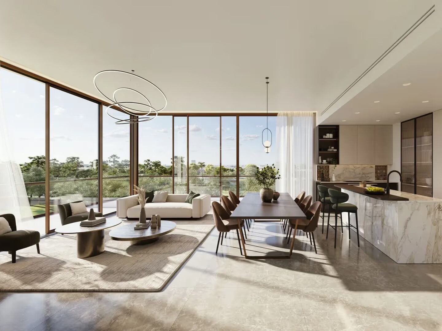 The apartment features a well-planned layout with seamless flow between living, dining, and kitchen spaces. Flawless finishes, premium flooring, and high-quality fixtures elevate the interior experience, while large windows allow abundant natural light, creating a bright and sophisticated atmosphere throughout the home. The modern kitchen is thoughtfully designed with sleek cabinetry and high-end materials, perfectly complementing the apartment’s refined aesthetic.