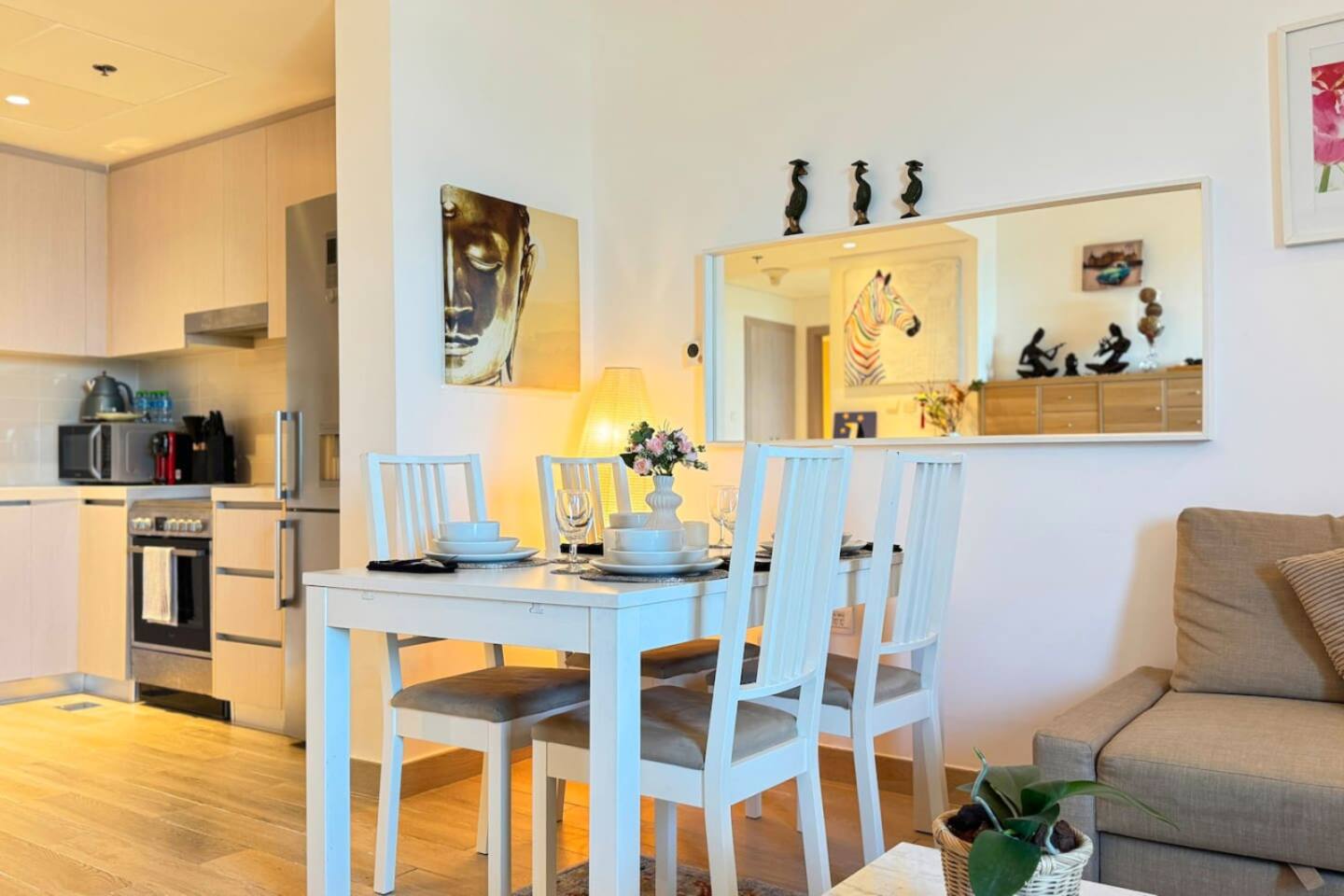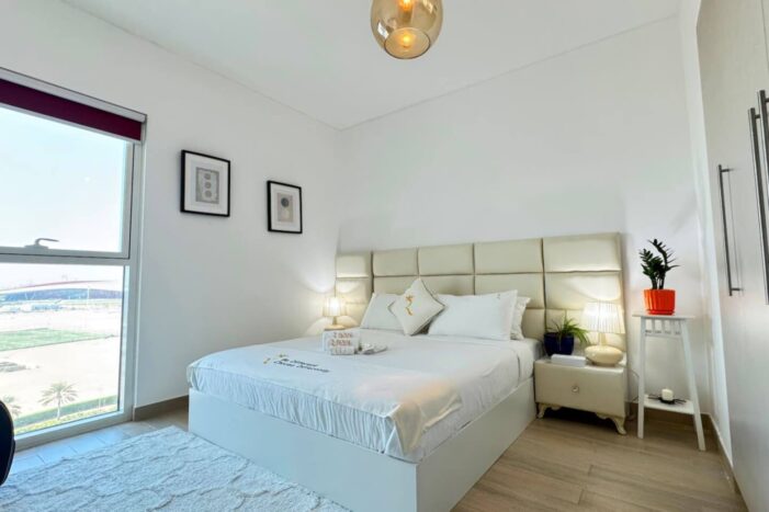 The development features a wide range of residential options, from cozy studios to spacious 3-bedroom units. This particular apartment stands out thanks to its fully furnished interiors, stylish finishes, and large windows that frame spectacular views of Ferrari World. The layout includes a bright living room, a modern open kitchen, a well-appointed bedroom with built-in wardrobes, and a sleek bathroom, making it an ideal choice for comfortable and stylish living.