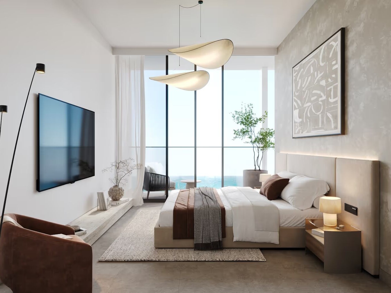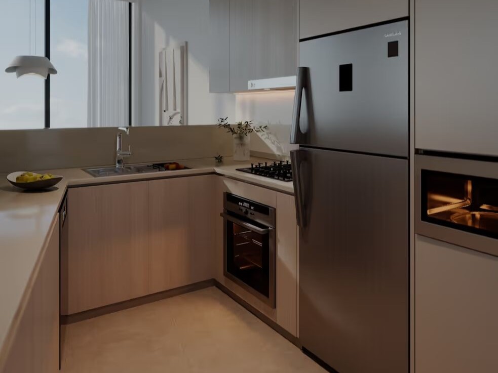 The contemporary kitchen is fitted with premium cabinetry, sleek countertops, and high-quality finishes, offering both elegance and functionality. The three spacious bedrooms include built-in wardrobes, while the master bedroom features an en-suite bathroom with refined fixtures.